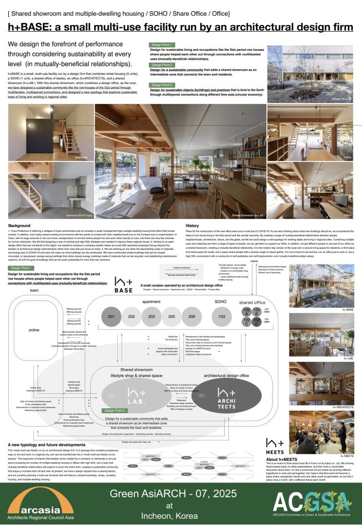 本日2025年9月8日〜12日に韓国・仁川で開催される Arcasia Asian Congress of Architects にて、弊社設計の「建築設計事務所が運営する小さな複合施設 h+BASE」のパネルが展示されます。